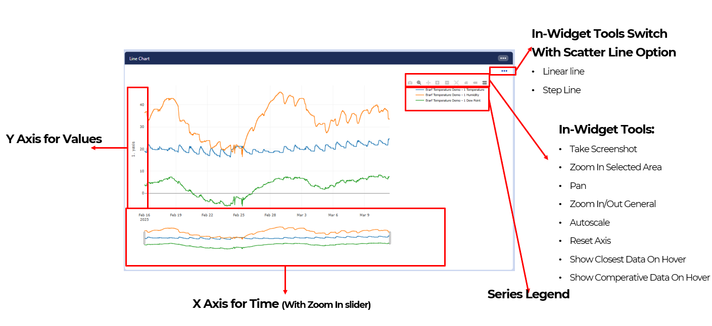 Similar to intensity chart, line chart has built-in analytics capabilities for better data handling.Its widget menu has multiple function to handle different time series simultaneously.