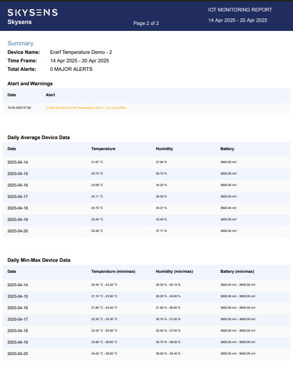 This report gives alerts, warnings, general information which consists daily  maximum,minimum and average readouts of selected asset.
