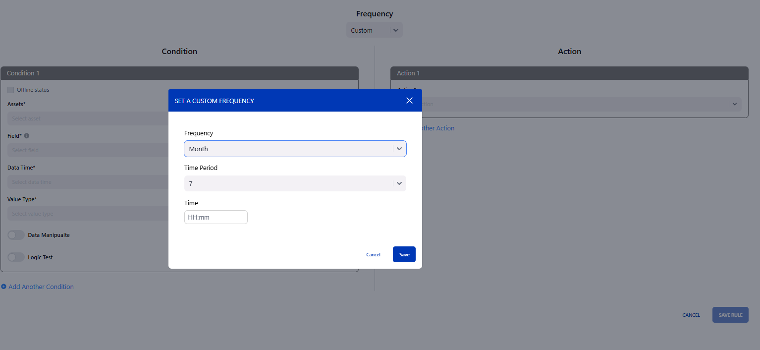 **Frequency:** User need to select from minute, hour, day, week, month and year options to select when to trigger the rule.