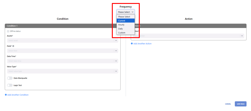 User can set rule trigger  for every time data arrives (Current) to subjected asset field or for beginning of every hour (Hourly) or every day (Daily).