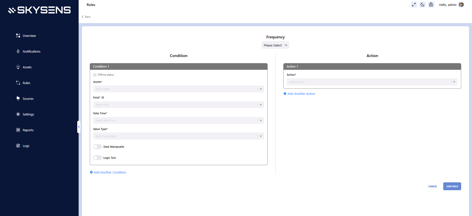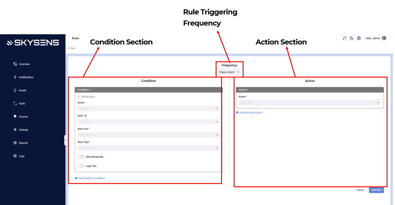 Rule detail page composes with two areas. As in standard logic workers, Condition and Action sides are available left and right with their unique features. Users can also decide triggering frequency of rule from frequency setting.